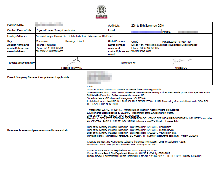 Brazilian Natural Mica Supplier Verification Report by Independent Auditor Bureau Veritas, 2017