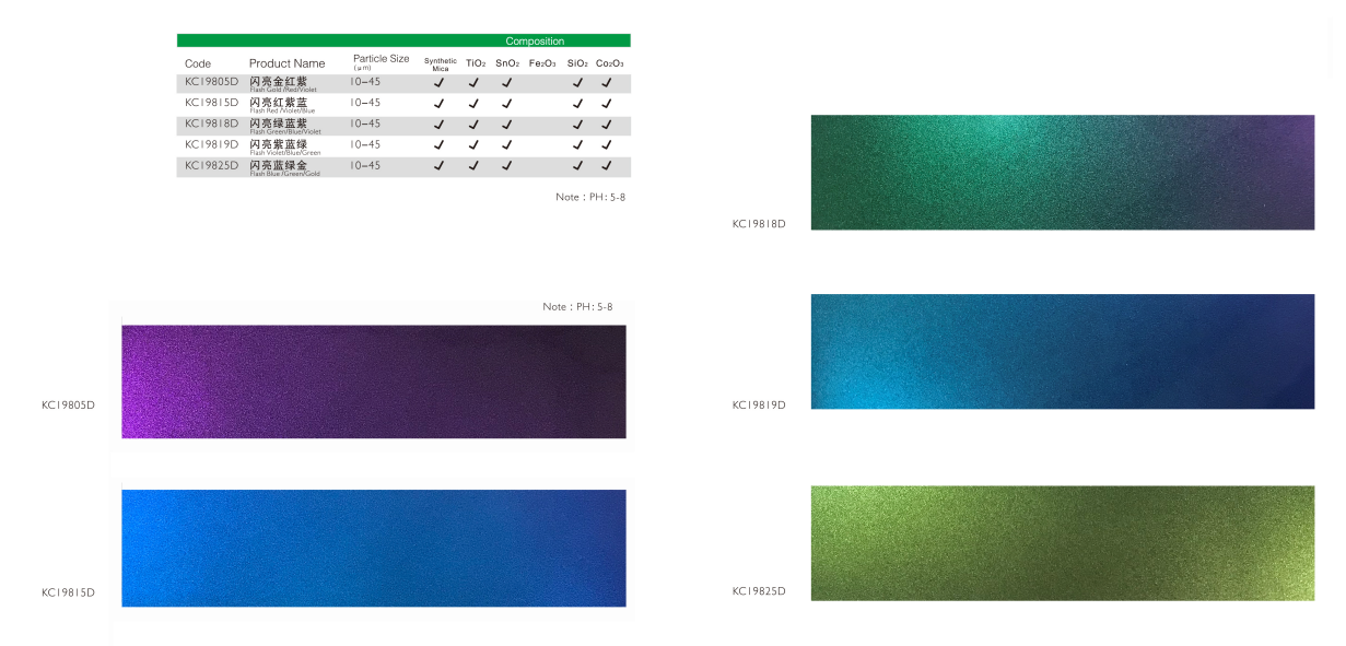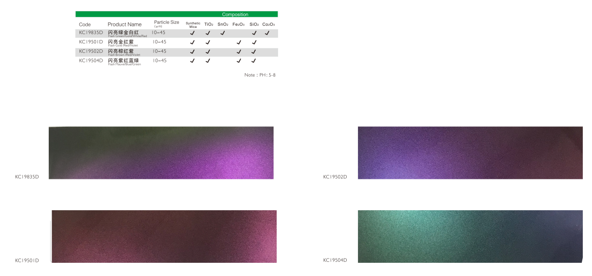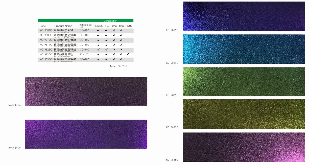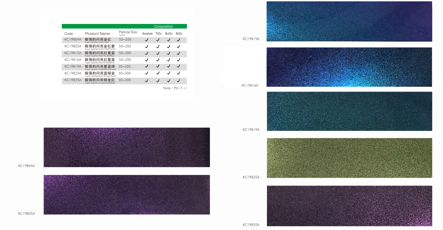 该系列珠光颜料具有卓越的变色效果,多样的色彩变化,色浓度表现优异,光泽度优于市场同类产品。