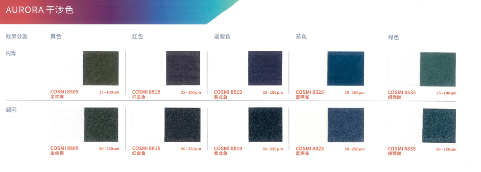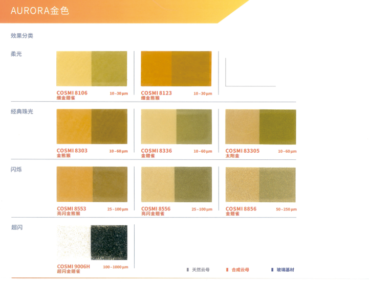 本产品采用合成云母基底,表面结构高度光滑规整,赋予其优异的光学性能。与CosPearl系列相比,其色彩表现更为纯净、鲜艳且闪耀,提供丰富色系选择:包括经典银白、干涉色、金色、金属色,以及高饱和度的黄、橙、粉、紫、蓝、绿、黑等强烈色彩,同时支持定制填料。产品具有高透明度与卓越的反射率,色度饱满且稳定(多数Aurora系列珠光颜料呈现纯白粉末基底,确保色彩还原度)。粒径覆盖小、中、粗多规格,可灵活适配不同妆效需求,广泛适用于化妆品及个人护理产品的开发,尤其适合追求高显色度与光泽感的配方设计。